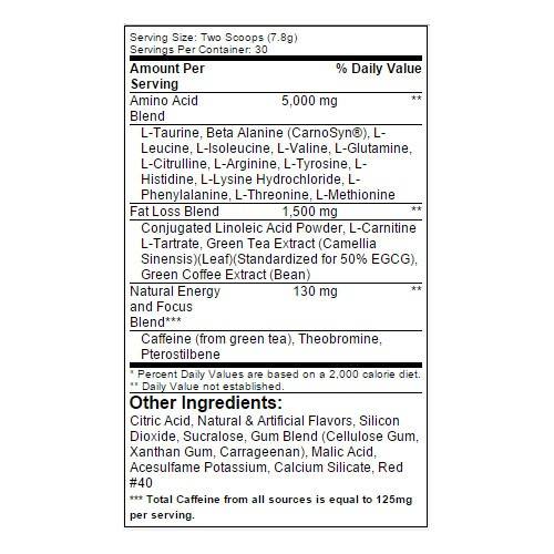 В состав Amino Lean входят натуральные тонизирующие вещества: кофеин и добываемый из плодов какао теобромин. Добавление теобромина, тонизирующий эффект которого более мягок, позволяет уменьшить дозировки кофеина и устранить нежелательные побочные эффекты от применения больших дозировок данного вещества.